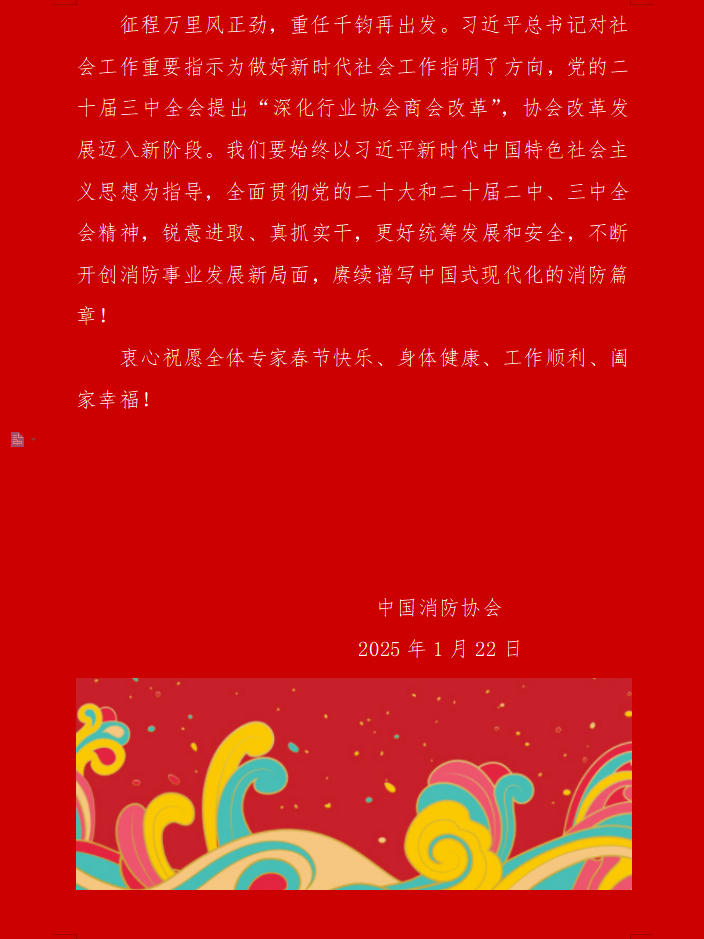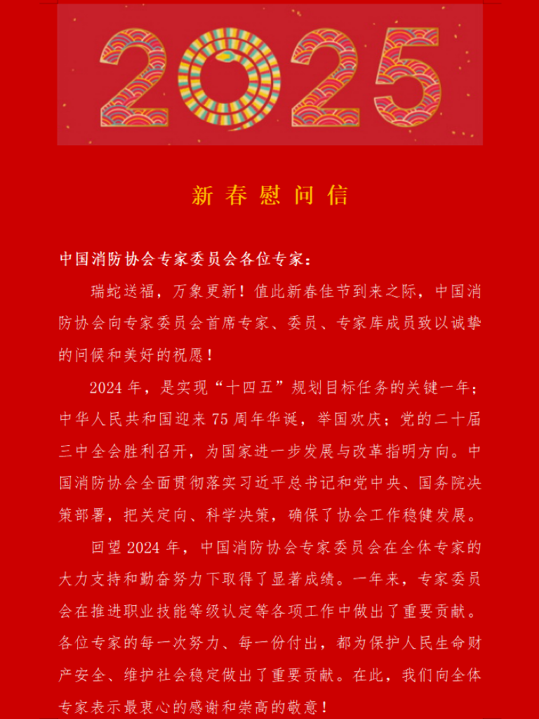 瑞蛇送福,萬(wàn)象更新!值此新春佳節到來(lái)之際,中國消防協(xié)會(huì )向專(zhuān)家委員會(huì )首席專(zhuān)家、委員、專(zhuān)家庫成員致以誠摯的問(wèn)候和美好的祝愿!