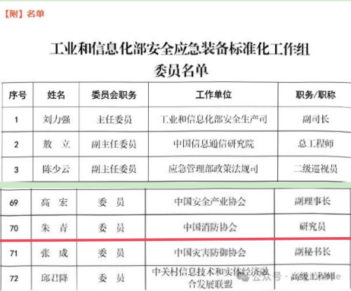 2025年3月3日,工業(yè)和信息化部公示了安全應急裝備標準化工作組委員名單,中國消防協(xié)會(huì )標準化工作委員會(huì )辦公室副主任、研究員朱青入選。