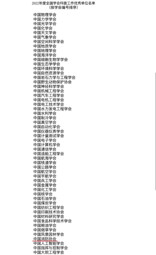 2022年12月28日,中國科協(xié)科普部發(fā)出《中國科協(xié)科普部關(guān)于公布2022年度全國學(xué)會(huì )科普工作優(yōu)秀單位的通知》 (科協(xié)普函綜字〔2022〕50號),對85個(gè)科普工作表現突出的全國學(xué)會(huì )予以表?yè)P,中國消防協(xié)會(huì )位列其中。