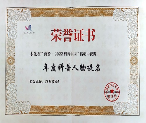 祝賀我會(huì )推薦的姜波榮獲“典贊•2022科普中國”年度“基層和社會(huì )科普人物”提名