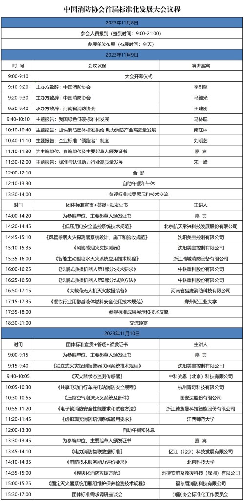 2023年11月9日-10日,“首屆消防標準化發(fā)展大會(huì )在河南省鄭州市-荊山賓館召開(kāi),大會(huì )由中國消防協(xié)會(huì )主辦,河南省消防協(xié)會(huì )承辦,會(huì )議采取政策宣講、主旨演講、展覽展示、標準宣貫、頒證儀式、交流晚宴、團體標準需求調研座談等形式召開(kāi)。
